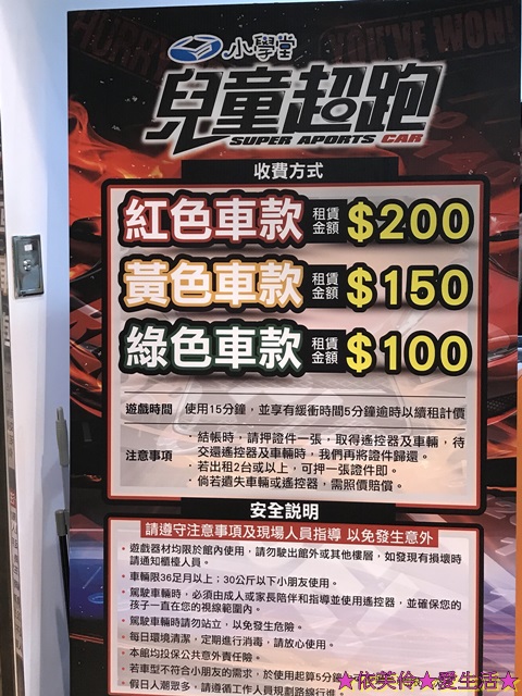 其實~這個跑車樂園是新的,上次來並沒有,而且感覺是【臨時營業】的感覺~~因為我說過了,汐止遠雄最厲害的就是它很大~~很大~~所以,感覺這個電動車,是臨時開跑的,因為,它就是一片空地給孩子開車,我覺得這個場地應該好好規劃跑道呀,或者是增加紅綠燈號誌之類的...這樣,孩子開起來會更好玩,更有成就感,也可以寓教於樂!